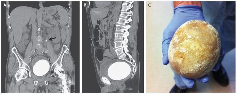 A 64-year-old man presented to the emergency department with a 3-day history of pain in the left flank and urinary retention. He had undergone radical cystectomy and orthotopic neobladder construction with intestinal segments more than a decade earlier because of invasive bladder cancer. Physical examination revealed tenderness in the left flank. Computed tomography of the abdomen and pelvis showed an obstructing stone in the left proximal ureter (arrow) and a very large stone in the neobladder (Panels A and B). The use of intestinal segments to create urinary diversions can lead to stone disease as a result of persistent bicarbonate loss in the urine, hyperoxaluria, and long-term colonization of urea-splitting bacteria in the urinary tract. Additional risks for stone formation in a continent urinary reservoir, such as in our patient’s neobladder, include urinary stasis, mucus production, and nonabsorbable surgical materials used to construct the substitute bladder. The stone in the left ureter was accessed by means of percutaneous nephrostomy with antegrade ureteroscopic assistance and was removed with the use of laser lithotripsy. The patient underwent an open neocystolithotomy to extract the neobladder stone, which was egg shaped and measured 12 cm by 9.5 cm by 7.5 cm, weighed 770 g, and was composed of 20% struvite and 80% calcium phosphate (Panel C). The patient had no postoperative complications and continues to be monitored for stone recurrence.