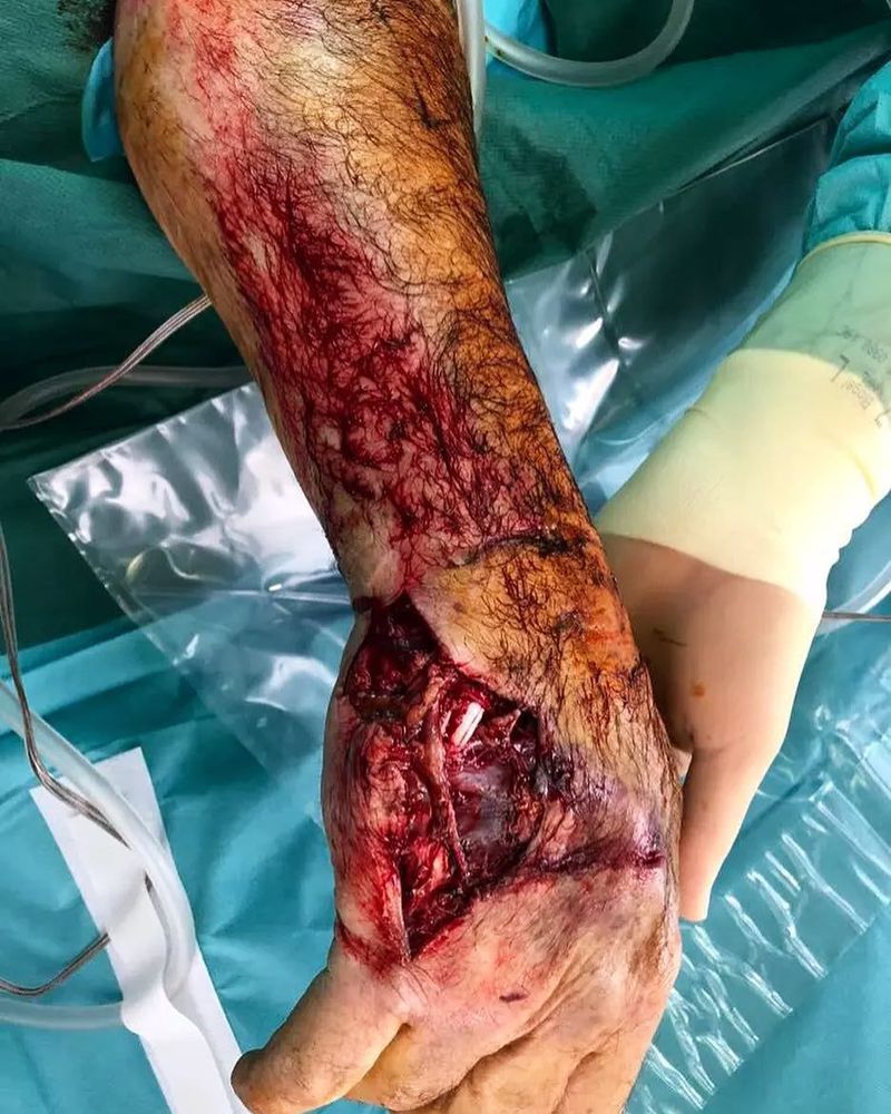 Crush crush!! This 45-year-old male sustained a severe crush injury during work!!! A crush injury occurs when mechanical force or pressure is put on a body part, causing compression of soft tissues and resultant muscle swelling or rhabdomyolysis, numerous bone fractures and severed vessels. When the muscles and tissues are deprived of blood for too long after a crush injury accident occurs, there is a strong chance that the nerves will become severely damaged (leading to numbness and paralysis) and the victim will experience muscle breakdown and death (rhabdomyolysis). Hence, one of the most feared complications after a crush injury is compartment syndrome, which occurs when muscles become swollen and fill the compartment to capacity, causing excessive pressure builds up inside an enclosed muscle space (typically where the injury took place), and resulting in insufficient blood supply to surrounding tissues.