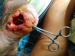 This patient has a diabetic foot ulcer, which can eventually lead to nontraumatic lower limb amputation! Diabetic neuropathy is the most common underlying cause for foot ulcer, usually develop around the margins of the foot. The neuropathy decreases pain sensation and pressure perception, it causes muscle imbalance leading to foot deformities, and impairs the microcirculation and integrity of the skin. The high pressure threshold and loss of monofilament sensation are the cause of increased risk of foot ulceration. These patients may also have other sensory deficits that include decreased vibratory sensation, decreased pinprick pain or temperature sensation. These patients don’t feel pain, so the most common cause of ulceration is repetitive mechanical forces of gait, which lead to callus, a preulcerative lesion in the neuropathic foot. If allowed to become too thick, the callus will press on the soft tissues underneath and cause ulceration. If the callus is not removed, inflammatory autolysis and haematomas develop under the callus. This leads to tissue necrosis, resulting in a small cavity filled with serous fluid giving the appearance of a blister under the callus. Removal of the callus reveals an ulcer.