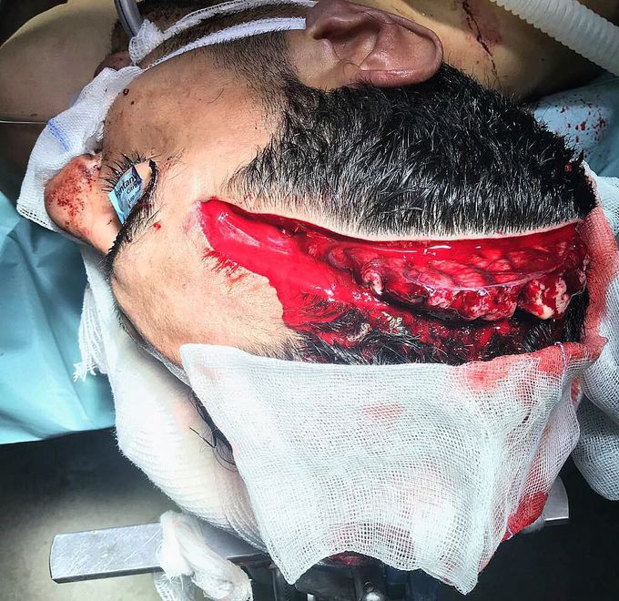 Extensive full thickness scalp laceration and traumatic brain injury in a patient who was involved in a motorcycle accident (head on collision with a truck). He was under the influence of alcohol on the night of New Year’s Eve in Morocco. Motorcyclists are at an especially high risk of suffering head injuries in an accident because of the relative lack of protection compared to drivers of passenger vehicles. In such cases, traumatic brain injury is the leading cause of death; and wearing a helmet is arguably the most important preventative measure for preventing motorcycle brain injury, aside from the alcohol part which cannot be stressed more than it already is. Patients usually present with a combination of reduced Glasgow Coma Scale, nausea/vomiting and/or amnesia, as well as a large haematoma with significant mass effect that required urgent neurosurgical evacuation. Photo by @dr.bengi