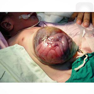 Now that's a pretty rare birth defect known as Omphalocele, in which an infant's intestine or other abdominal organs are outside of the body because of a hole in the belly button area. The intestines are covered only by a thin layer of tissue and can be easily seen. It is a type of hernia. The muscles in the abdominal wall (umbilical ring) do not close properly. As a result, the intestine remains outside the abdominal wall. Prenatal ultrasounds often identify infants with an omphalocele before birth. Otherwise, a physical examination of the infant is enough.Surgical repair is the treatment.