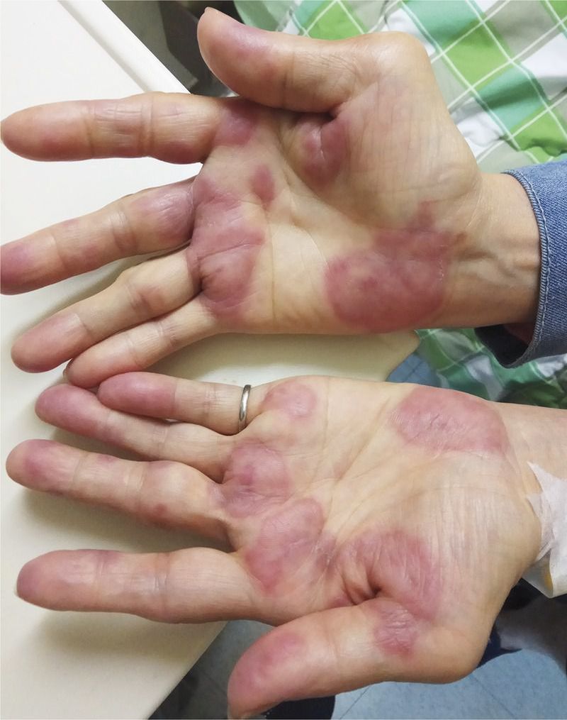 A 52-year-old woman with rheumatoid arthritis presented with a 1-month history of multiple painful, erythematous plaques on her palms and the fingers. One and a half years earlier, she had been treated with etanercept for 6 months. At the time of this presentation, her maintenance medications for rheumatoid arthritis included sulfasalazine and azathioprine; this regimen had been stable for 3 years. In addition to the skin lesions, which were limited to the palms and fingers, physical examination revealed ulnar deviation and Z deformity of both hands — findings consistent with chronic changes due to rheumatoid arthritis. The patient was afebrile. Laboratory testing revealed an erythrocyte sedimentation rate of 50 mm per hour (normal value, <15), a C-reactive protein level of 20.2 mg per liter (normal value, <3.5), and a white-cell count of 3670 per cubic millimeter with 87% neutrophils. A skin biopsy revealed papillary dermal edema and perivascular and interstitial lymphohistiocytic and neutrophilic infiltration consistent with the inflammatory disorder Sweet’s syndrome (also called acute febrile neutrophilic dermatosis). The differential diagnosis includes vasculitis, drug eruption, and infectious processes. After a short course of methylprednisolone therapy, the skin lesions resolved and did not recur over 1 year of follow-up. The patient’s treatment regimen for rheumatoid arthritis was continued.