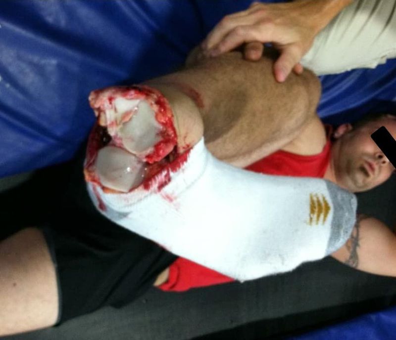 This patient went to indoor trampoline park. The patient presented after sustaining an inversion injury to his right ankle after a failed landing on a trampoline. On examination there was a large lacerated wound over the dorsolateral aspect of the right ankle. The distal articular surfaces of the fibula and the tibia were exposed. Additional information was unfortunately not available. Ankle dislocations do not happen spontaneously but are a result of a trauma. Forces are placed on the ankle that cause the bones to fracture or the ligaments to tear, resulting in the dislocation injury. The ankle is an inherently stable joint and the direction of the dislocation depends upon the position of the foot and where the force arises.Most commonly, a dislocated ankle is associated with fractures of the distal ends of the tibia and fibula (called the malleolus) in association with damage to the ligaments that help support the ankle joint.Previous ankle sprains, medial malleolar hypoplasia, weakness of the peroneal muscles and ligamentous laxity are predisposing factors for dislocation.