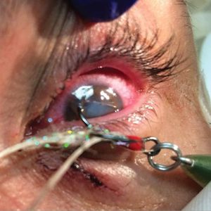 A man in his 30s presented with a fishhook injury to his left eye and lower eyelid after fishing in Everglades National Park. His visual acuity was hand motions, and intraocular pressure measurement was deferred in that eye. Findings from examination of the left eye showed a penetrating injury with a 3-pronged barbed fishhook, with 1 prong lodged in the anterior chamber and another lodged in the lower eyelid. The status of the crystalline lens was unclear owing to corneal edema. No hypopyon was visualized. The patient was brought to the operating room for removal of the fishhook, closure of the cornea and eyelid lacerations, and injection of intracameral antibiotic drugs.