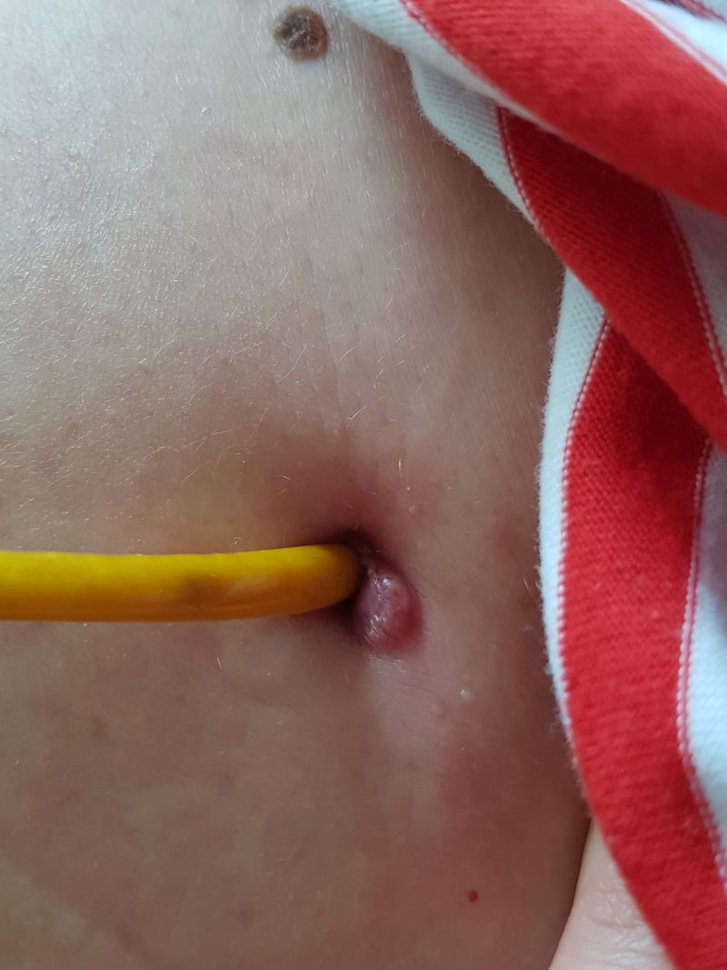 Patient is 59 y/o female, degenerative MS since 20 years, Bed bound for 5 years. PEG has been places July 2019, without any infections or complications till now. This abscess-like protuberance appeared 3 days ago, reported itchiness and pain. What is your diagnosis and treatment plan pls?