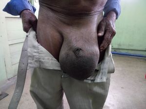 45 years male patient with H/O large swelling in inguinoscrotal region for last 2 years, swelling was gradually increasing in size with occasional mild pain. On clinical examination cough impulse was positive, reducebility was absent, fluctuation was positive, trans illumination was positive in some part, getting above the swelling was not possible. Clinical diagnosis - B/L inguinal hernia with B/L hydrocele.
