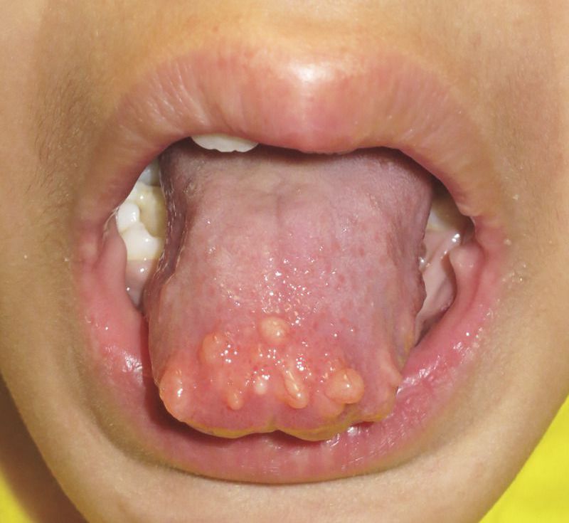 A 7-year-old boy presented to the pediatric otolaryngology clinic with a 3-year history of multiple firm, painless, slow-growing nodules on his tongue. He had a history of mild developmental delay, and a physical examination showed a high arched palate and marfanoid habitus. Excisional biopsies of the lesions on the tongue revealed mucosal neuromas. Multiple endocrine neoplasia type 2B was suspected. Ultrasonography of the neck revealed hypoechoic thyroid nodules without cervical lymphadenopathy. The calcitonin level was 407 ng per liter (normal value, <6); serum levels of metanephrines were within the normal range. There was no family history of multiple endocrine neoplasia. Genetic testing confirmed a pathogenic mutation in the gene encoding ret proto-oncogene (RET). Multiple endocrine neoplasia type 2B is an autosomal-dominant syndrome characterized by mucosal neuromas, pheochromocytoma, and medullary thyroid carcinoma. Early diagnosis of medullary thyroid cancer is critical to improving long-term outcomes; therefore, the recognition of nonendocrine manifestations is important in this syndrome. The child underwent a total thyroidectomy and bilateral neck dissection, which revealed three separate foci of medullary microcarcinoma without extrathyroidal spread. At a 9-month follow-up visit, the child had recovered well from surgery and was growing normally. After the visit, he continued to undergo routine clinical surveillance.