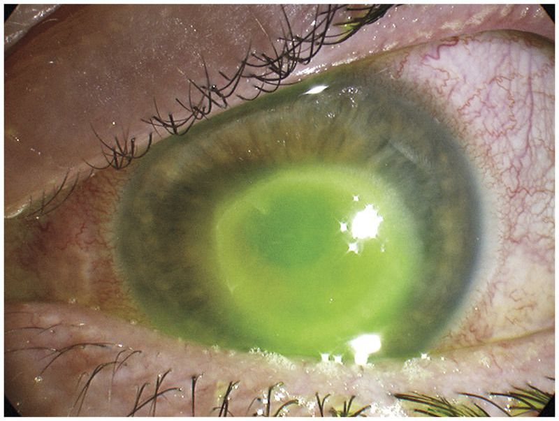 A 41-year-old woman presented to the ophthalmology clinic with a 2-month history of intermittent pain, blurry vision, and sensitivity to light in her left eye. She wore monthly disposable soft contact lenses that she kept in her eyes while swimming and showering. The patient had difficulty keeping her left eye open during the physical examination, which revealed redness of the conjunctiva. The visual acuity was 20/20 in the right eye and 20/200 in the left eye. A large, ring-shaped infiltrate was present in the left eye, along with corneal haze and an overlying epithelial defect, which showed uptake of fluorescein dye. Cultures from corneal scrapings grew Acanthamoeba polyphaga. She received a diagnosis of acanthamoeba keratitis, a vision-threatening infection most commonly associated with contact lens wear. The patient was treated with topical polihexanide and propamidine isethionate. Although the infection resolved, the vision in her left eye was not restored, owing to a dense, central corneal scar and cataract. Twelve months after the initial presentation, the patient underwent deep anterior lamellar keratoplasty, which resulted in a postoperative visual acuity of 20/80 and no discomfort in her left eye.