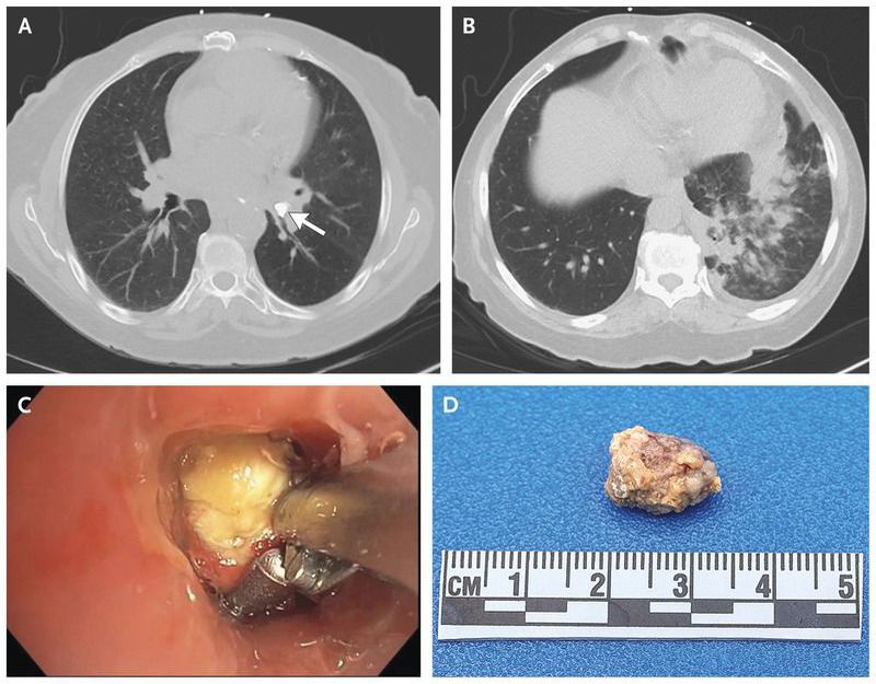 A 68-year-old woman presented to the emergency department with a 3-day history of worsening shortness of breath, wheezing, dry cough, fevers, and chills. Her oxygen saturation was 96% while she was breathing ambient air. Pulmonary examination revealed crackles in the left lower lobe. Computed tomography of the chest showed an obstructing broncholith in the bronchus of the left lower lobe (arrow in Panel A, bone-window setting) with peribronchial ground-glass and patchy consolidation (Panel B, lung-window setting). Flexible bronchoscopy revealed a loose broncholith that was obstructing the proximal bronchus of the left lower lobe (Panel C). The broncholith, which measured 1.00 by 1.45 cm (Panel D), was grasped and gently retracted. Broncholiths are most commonly formed by peribronchial lymph nodes that calcify and migrate into the lumen of the bronchus. Lymphatic calcification can develop after chronic granulomatous infection, such as histoplasmosis or tuberculosis. Cultures of bronchoalveolar-lavage fluid were negative for mycobacterial, bacterial, and fungal organisms. An interferon-gamma release assay to test for evidence of previous tuberculosis exposure was negative, and serologic testing for histoplasmosis was negative. The patient was treated with antibiotics for postobstructive pneumonia, and her symptoms resolved.