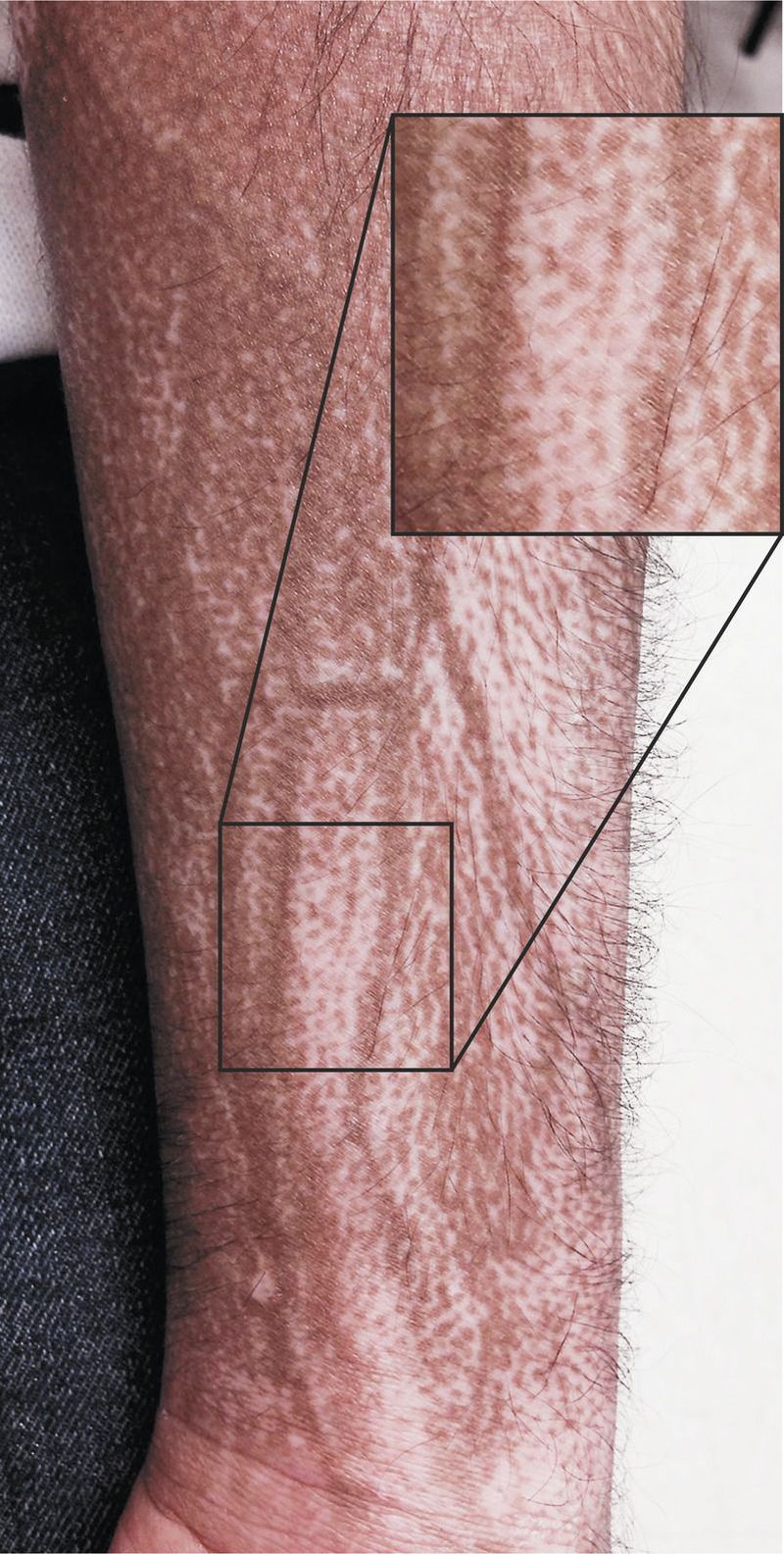A 31-year-old man with an 8-month history of progressive shortness of breath and skin changes presented to the emergency department. Examination of the skin revealed areas of depigmentation with relative sparing of the perifollicular areas and preservation of pigmentation over the veins. A biopsy specimen of the forearm showed hyalinized collagen in the dermis that was consistent with scleroderma. Pigment loss and melanophages were observed in the papillary dermis. The salt-and-pepper skin changes represent vitiligo-like depigmentation, which spares the perifollicular area. The capillary network of the hair follicles preserves melanogenesis and maintains pigmentation. The pulmonary symptoms noted at the patient’s initial presentation were due to interstitial lung disease. The cutaneous and pulmonary findings were consistent with a diagnosis of scleroderma. Mycophenolate mofetil and prednisone were administered to treat both the cutaneous and the pulmonary symptoms, and the patient has had a partial response. He continues to have pulmonary symptoms.