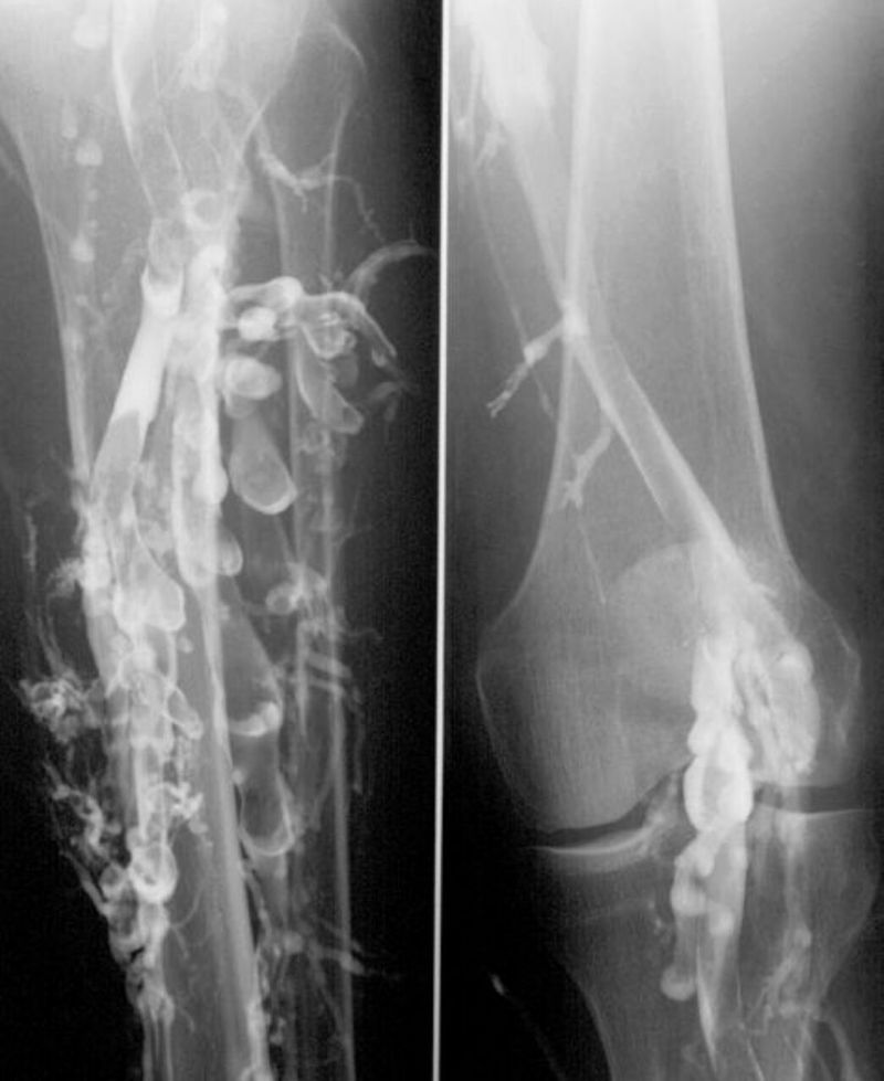 Phlebography in a patient with deep venous thrombosis (DVT)