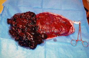 That’s how placental abruption looks like, a pile of tissue with the presence of a huge hematoma (blood clot) attached due to a concealed hemorrhage where the blood pooled behind the placenta. Placental abruption is the premature separation of the placenta from the uterus before childbirth, and it can present with acute vaginal bleeding (explaining the hemorrhage and hematoma or blood clot that can be formed between the placenta and uterus), a distended uterus with unstopped contractions, and abdominal pain. In the early stages of placental abruption, there may be no symptoms. When symptoms develop, they tend to develop suddenly. Hematoma formation further separates the placenta from the uterine wall, causing compression of structures and compromise of blood supply to the fetus, causing fetal distress. Treatment depends on the amount of blood loss and the status of the fetus. If the fetus is mature enough (more than 36 weeks) and is not in distress, immediate vaginal delivery may be indicated. If either the mother or fetus are in distress, Caesarean section is done.
