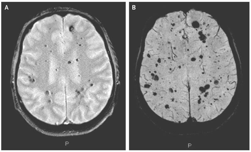 A 59-year-old man presented to an outpatient clinic with a 1-year history of progressively worsening headaches. Neurologic examination was normal; skin examination revealed multiple hyperkeratotic papules and bluish, nodular skin lesions. Magnetic resonance imaging of the brain revealed numerous lesions consistent with cerebral cavernous malformations involving the cerebral hemispheres, cerebellum, and brain stem (Panel A shows a T2-weighted, fast field echo image, and Panel B a blood oxygenation level–dependent image; P denotes posterior). Cavernous malformations occur primarily in the brain but may also be found in the skin, spinal cord, and retina. A proportion of patients with cerebral cavernous malformations are asymptomatic, whereas others present with neurologic symptoms, such as seizures, headaches, and even fatal cerebral hemorrhage. Cerebral cavernous malformations can be sporadic or familial. The patient’s mother and maternal grandfather had cutaneous lesions similar to those in our patient but had not undergone brain imaging. Genetic analysis in our patient revealed a mutation in KRIT1 (also called CCM1) that was compatible with the diagnosis of the familial cerebral cavernous malformation syndrome. Owing to the vast number of cerebral cavernous malformations, neurosurgical treatment was not an option. This patient continues to have intermittent headaches, which are partially alleviated by beta-blockers. Mild cognitive decline with memory deficits has also developed.