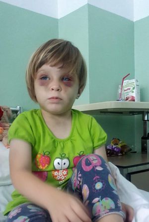 This little girl was physically abused by her mother. Raccoon eye/eyes or periorbital ecchymosis is a sign of basal skull fracture or subgaleal hematoma, a craniotomy that ruptured the meninges, or (rarely) certain cancers. They may not appear until up 2–3 days after the injury. It is recommended that the patient not blow their nose, cough vigorously, or strain to prevent further tearing of the meninges. Depending on cause, raccoon eyes always require urgent consultation and management, that is surgical (facial fracture or post-craniotomy) or medical (neuroblastoma or amyloidosis).