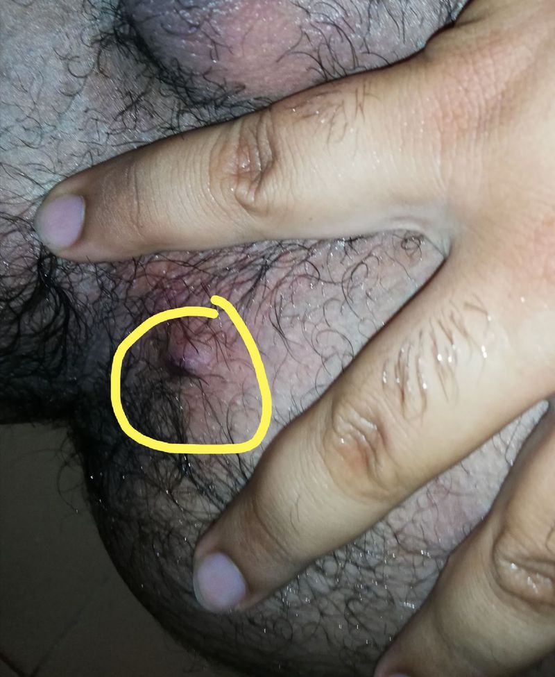 A young Patient age 24 yrs came with a history of 1 week of small pimple at his left buttock area just below the scrotum near anus, after a week his pimple got enlarged in size and was slightly itchy and non painful, he only notices it on defication time otherwise there are no signs and symptoms. He also has 2-3 pimples on his neck but there is mark difference in color of pimples on neck and in between at near the anus region
