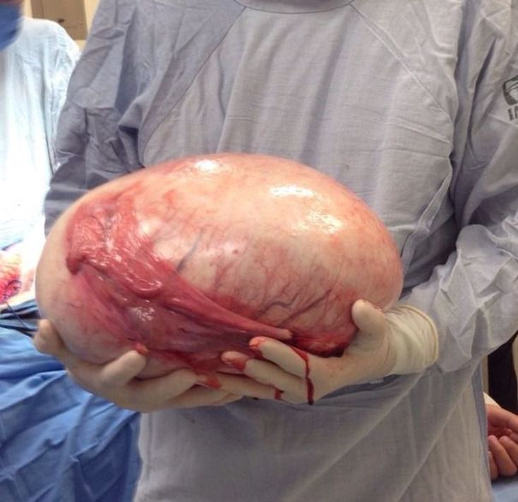 I had an ovarian tumor over 9lbs. missed by three hospitals in two states over a two year period. Finally dx when it torsed, pain was so bad I couldn’t stand unaided or stop vomiting. Films showed organs displaced, entire abdominal cavity filled with tumor. Benign, very long recovery.