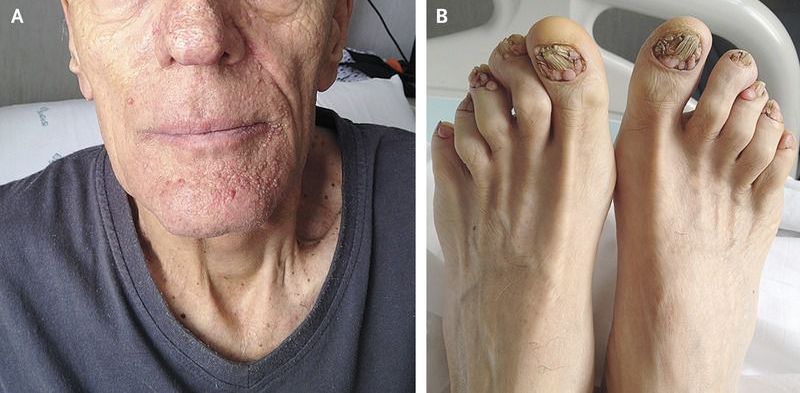 A 71-year-old man presented to the nephrology department for the evaluation of chronic kidney disease, which had developed during the past 20 years. The patient had received a diagnosis of tuberous sclerosis complex, or Bourneville’s disease, in his late 20s. The physical examination revealed erythematous papules on the chin, nose, and cheeks consistent with facial angiofibromas (Panel A) and small, fleshy periungual fibromas of the toenails (Panel B). The patient had no history of seizures or developmental delay, and he had no family history of similar cutaneous findings. Tuberous sclerosis complex is an autosomal dominant condition that affects cellular differentiation and proliferation. The condition is characterized by the development of hamartomatous lesions that can affect many organ systems, including the central nervous system, eyes, skin, and kidneys. Facial angiofibromas consist of blood vessels and fibrous tissue. Periungual fibromas are benign tumors that are composed of connective tissue and typically appear in the second decade of life or later. Patients with this condition often have renal involvement, including the formation of angiomyolipomas or extensive renal cysts. For this patient, we recommended low salt intake, tight blood-pressure control (<130/80 mm Hg) with 5 mg of amlodipine twice daily, and avoidance of nonsteroidal antiinflammatory drugs. One year later, he had stable kidney function and unchanged cutaneous findings.