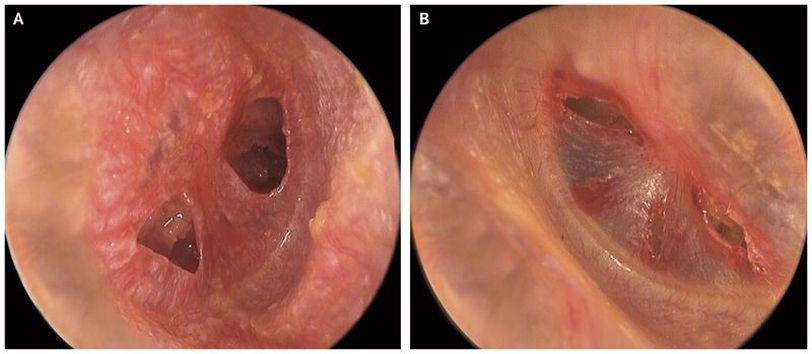 A 30-year-old man presented to the emergency department with new-onset hearing loss and tinnitus in both ears after a blast injury. While at a wedding that included celebratory fireworks, he had been standing near a sand-filled mortar when it accidentally ignited. Otoscopy revealed multiple perforations of both tympanic membranes (Panel A shows the right ear, and Panel B the left ear). Audiometry revealed mild conductive hearing loss (20-dB hearing level) and moderate sensorineural hearing loss at 4000 Hz (40-dB hearing level) in each ear. Perforation of the tympanic membrane can occur after a high-energy blast injury. Sharp-edged radial or triangle-shaped perforations and bleeding margins are likely to indicate a traumatic origin of a tympanic-membrane perforation. Small perforations are often managed with observation alone, but larger perforations may be patched to prevent water from entering the middle ear and to improve healing. If sudden hearing loss after a blast injury is accompanied by acute vertigo with nystagmus, exploration of the middle ear can be useful to rule out fistula to the inner ear. The patient underwent patching of the perforations. Three months later, his audiographic results had normalized, and otoscopy revealed healed eardrums in both ears.