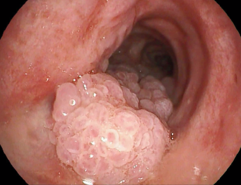 A 63-year-old man presented to the pulmonary clinic with a 3-month history of worsening dry cough and exertional dyspnea. He had a history of infection with the human immunodeficiency virus and had been receiving prescribed antiretroviral treatment intermittently for several years. His CD4 count was 81 cells per cubic millimeter. Expiratory wheezing was noted on lung auscultation. Computed tomography of the chest revealed multiple polyploid lesions protruding into the lumen of the trachea and the left and right main-stem bronchi. Findings on bronchoscopy were notable for numerous sessile, friable, wartlike lesions on the posterior wall of the trachea and the left and right main-stem bronchi. Histologic examination revealed squamous papillomas with moderate dysplasia on the surface epithelium, and human papilloma virus type 11 was detected on polymerase-chain-reaction assay. A diagnosis of respiratory papillomatosis was made. The patient underwent laser-assisted mechanical debulking and reported substantial abatement of his symptoms. On follow-up 7 months later, the CD4 count had increased to 171 cells per cubic millimeter. He had recurrence of symptoms and underwent further debulking of recurrent papillomas.