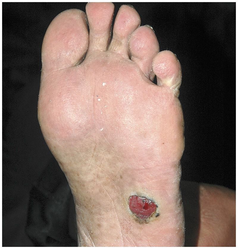 An 80-year-old man presented with a lesion on the left sole that had been increasing in size during the past 2 years. The lesion had become increasingly ulcerated, with intermittent bleeding. The physical examination revealed a well-defined, fleshy, reddish plaque measuring 2 cm in diameter with erosions on the surface and black areas at the periphery. A melanoma with a Breslow depth of 1.1 mm was identified on biopsy. Immunohistochemical examination showed tumor cells that were positive for S-100 protein and HMB-45 and negative for AE1/AE3. On the basis of these findings, a diagnosis of amelanotic melanoma was made. The general absence of pigment in amelanotic melanoma can lead to confusion with more benign skin conditions, including pyogenic granulomas, warts, and ulcers. Prompt investigation is important to avoid a delay in diagnosis. The patient was referred to an oncology clinic for further treatment but did not attend and was lost to follow-up