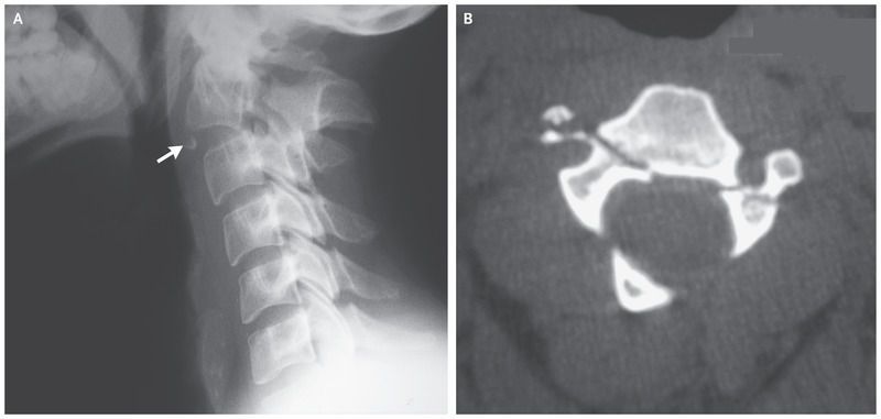 A 25-year-old man presented to the emergency department with severe neck pain after he was involved in a high-speed collision between two vehicles. He had full strength in his arms and legs, normal sensation to light touch and pinprick, and no sphincter disorders. A lateral radiograph (Panel A) showed disruption of the intervertebral disk between the C2 and C3 vertebrae, posterior angulation of the C2 vertebra fragment, fracture of the left pedicle of the axis, and a small inferior anterior fragment (arrow). An axial computed tomographic scan (Panel B) confirmed that the right and left pedicles of the C2 vertebra were fractured. Traumatic spondylolisthesis of the axis, also known as a hangman’s fracture, is caused by hyperextension of the neck. These fractures are classified according to the degree of anteroposterior deviation, presence of disruption of the posterior longitudinal ligament, position of the fracture line, and presence of a facet-joint dislocation. Stable fractures with minimal displacement may be managed conservatively with external immobilization, but unstable fractures, as in this case, require surgical stabilization. The patient underwent anterior fusion of the C2 and C3 vertebrae, and at follow-up 4 years later, he had no neurologic deficits and was free from pain.