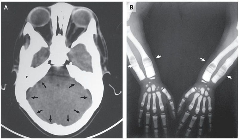 A 6-year-old girl was brought to the dentist by her parents, who reported that she had only a single tooth. Her medical history revealed that she was the child of consanguineous parents. She had partially impaired hearing and had lost her vision at 2 years of age. In addition, she had strabismus, frontal bossing, ocular hypertelorism, and short stature. Laboratory studies were notable for a serum calcium level of 5.7 mg per deciliter (1.42 mmol per liter; normal range, 8.7 to 10.3 mg per deciliter [2.18 to 2.58 mmol per liter]) and normal serum phosphorus and alkaline phosphatase levels. Computed tomography revealed diffusely thickened bones of the skull (Panel A, arrows). A radiograph of the wrists showed alternating sclerotic and lucent bands (Panel B, arrows). These findings were consistent with a diagnosis of osteopetrosis, a rare inherited disorder that is characterized by increased bone density. Typically, mutations in one of several genes lead to impaired osteoclast function and failure of bone resorption. Complications can include cranial nerve compression, brittle bones, and bone marrow failure. Calcitriol was initiated, and the patient was referred for interferon gamma-1b therapy; however, she was lost to follow-up.