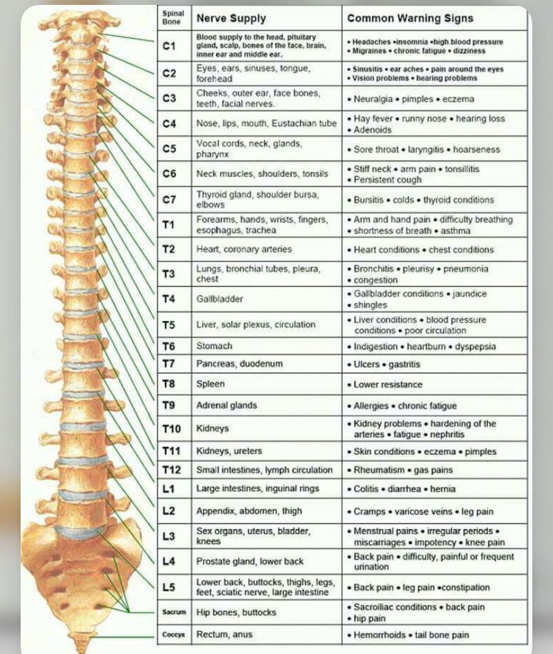 It shows the Nerve supply of every vertebrae. It will also show common warning signs that come when something is wrong in the spine.