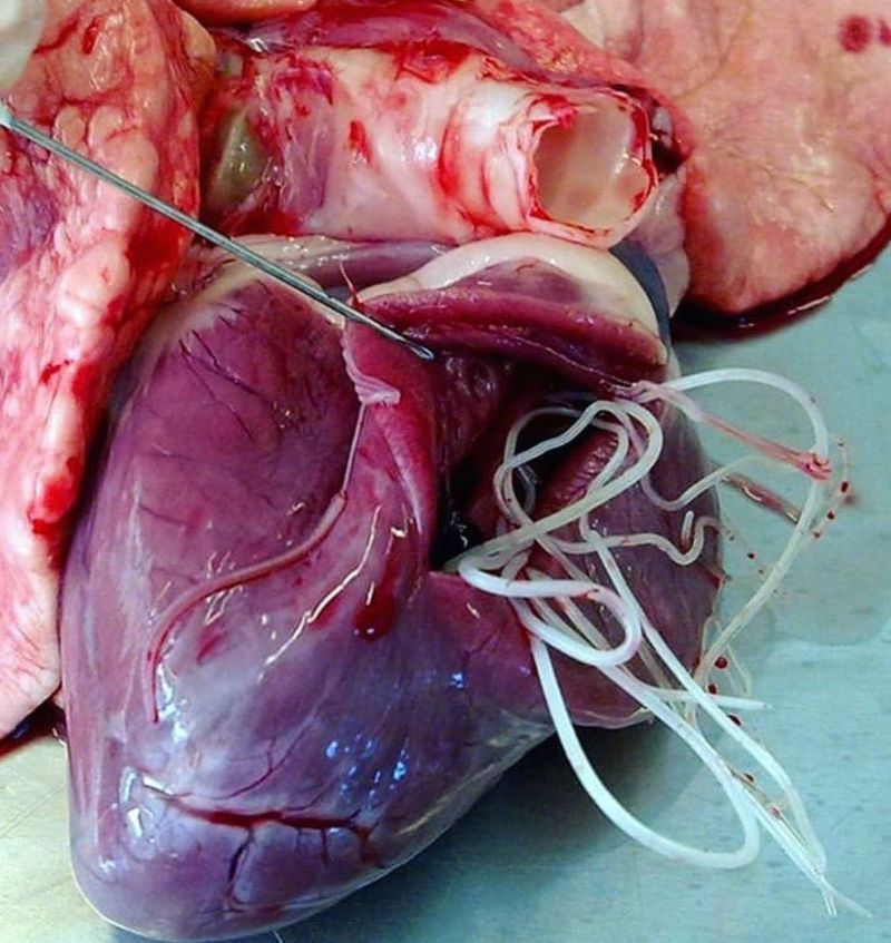 Heartworm is an important problem in dogs. It’s a parasitic disease caused by Dirofilaria immitis and is spread by mosquitoes. It can cause serious, even fatal disease, and routine testing and preventive medication is an important thing for dogs in areas where D. immitis is present. Dogs (wild and domestic) are the natural host for this parasite, but other species can be accidentally infected, including people and cats. People become infected by being bitten by a mosquito that is carrying the parasite, having acquired it from an infected dog. Human infections seem to be quite uncommon and, interestingly, while this is a serious problem in dogs, it tends to be rather innocuous in people. In fact, the biggest problem with heartworm infection in people is the fact that it can be confused with other, more serious problems, leading to invasive testing. After infecting someone, D. immitis works its way to the blood vessels in the lungs. This can result in a small area of inflamed tissue in the area. If a chest x-ray is taken, a "coin lesion" (a small, usually 1-3 cm spot) is often present. The parasite infection usually doesn’t cause any problems in people, but lung cancer and tuberculosis can look the same on x-rays. Usually, open-chest surgery ends up being performed to get a biopsy of the area because of the concerns about cancer. In heartworm cases,the biopsy identifies the problem as D. immitis, which is much better than cancer, but the risks associated with having undergone such an invasive procedure are much greater than that of the parasitic infection itself. Typically, treatment is not recommended in people because the infection rarely causes problems and people are "dead end" hosts, meaning they cannot pass on the infection. (Unlike in dogs, infected people don’t have the parasite microfilaria in their blood, which is how the infection is passed on to mosquitoes and other animals). Heartworm is a rare and rather innocuous problem in humans – it’s nothing to lose sleep about.