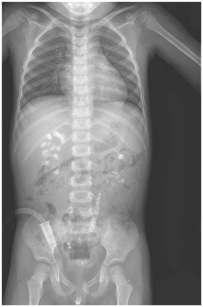 A 3-year-old boy presented to the pediatric urology clinic with a 6-month history of gross hematuria and intermittent abdominal pain. Urinalysis revealed red cells, white cells, and 3+ protein. The serum creatinine level was 0.9 mg per deciliter (80 μmol per liter; normal range in 3-year-old Chinese children, 0.3 to 0.8 mg per deciliter [20 to 70 μmol per liter]). The 24-hour urinary excretion of oxalate was elevated. A radiograph of the abdomen showed stones in the kidneys, bladder, and left ureter. Constituent analysis of the excreted stones indicated that the composition of the stones was more than 95% calcium oxalate monohydrate. On the basis of the clinical data, primary hyperoxaluria type 1 was suspected. Mutational analysis of AGXT, the gene encoding alanine–glyoxylate aminotransferase, confirmed the diagnosis in this patient. Primary hyperoxaluria type 1 is a rare autosomal recessive disorder of glyoxylate metabolism that leads to recurrent urolithiasis alone or in combination with nephrocalcinosis. Supportive measures were initiated, including high fluid intake and oral potassium citrate and vitamin B6. During 1 year of follow-up, the patient continued to have elevated levels of urinary oxalate and multiple kidney stones.