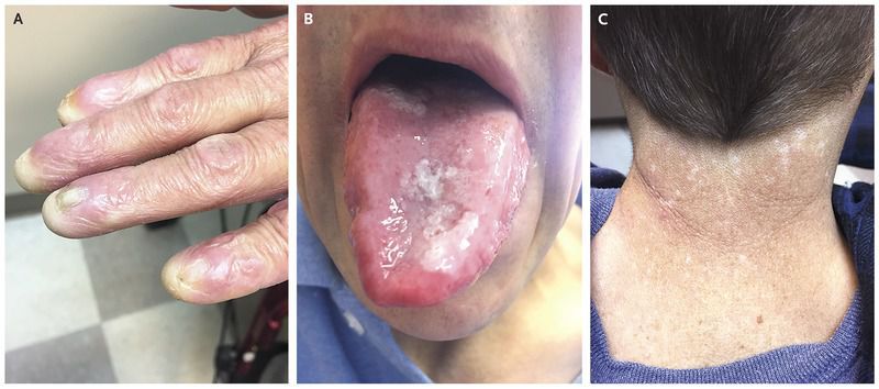A 52-year-old man presented to the pulmonary clinic with a 2-month history of cough and dyspnea on exertion. He had a history of pancytopenia, although previous evaluation, including bone marrow biopsy, had not resulted in any diagnosis of the cause. His brother had died after undergoing bone marrow transplantation for aplastic anemia. Physical examination revealed short stature, thin graying hair, missing teeth, nail dystrophy (Panel A), tongue leukoplakia (Panel B), and reticulated hypopigmentation of the neck (Panel C). Computed tomography of the chest revealed characteristic findings of pulmonary fibrosis that were predominant in the lower lobes. The triad of nail dystrophy, mucosal leukoplakia, and skin findings led to a clinical suspicion of dyskeratosis congenita. Dyskeratosis congenita is a heritable disorder of telomere maintenance that causes short telomeres, leading to manifestations such as bone marrow failure, cancer, and pulmonary fibrosis. Testing of peripheral-blood leukocytes confirmed that the telomere lengths in this patient were below the 1st percentile for age. The patient began taking danazol, a synthetic androgen that may lengthen telomeres, and had subsequent increases in his platelet, red-cell, and white-cell counts.