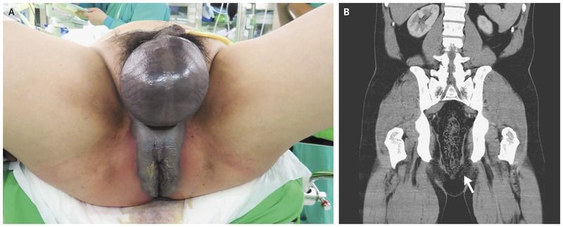A 46-year-old man with uncontrolled type 2 diabetes and alcoholic liver disease presented to the emergency department with painful swelling in the scrotum and perianal region. His temperature was 37.7°C, his pulse 130 beats per minute, and his blood pressure 97/61 mm Hg. The physical examination was notable for necrotic-appearing tissue in the scrotum and perineum, with areas of induration and crepitus (Panel A). Computed tomography revealed subcutaneous emphysema in the scrotum and perianal fascia, in addition to air in the pararectal fascia and rectal wall (Panel B, arrow). A diagnosis of Fournier’s gangrene, or necrotizing fasciitis of the perineum, was made. Fournier’s gangrene is a rare, life-threatening, fulminant infection. Elderly men and men with diabetes and chronic alcohol-use disorder are at increased risk. The patient underwent prompt laparoscopic-assisted abdominal perineal resection. Pathological analysis revealed multiple gas-filled pockets in necrotic tissue, with neutrophilic infiltration. In addition to surgery, the patient received fluid resuscitation and broad-spectrum antibiotics. Approximately 3 weeks after surgery, split-thickness skin grafting was performed for perineum reconstruction. The patient was discharged home with a permanent colostomy.
