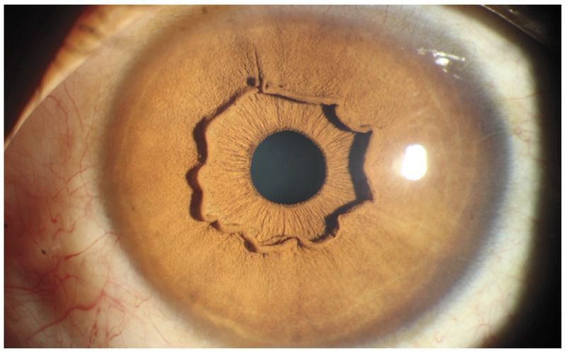 A 37-year-old woman presented to an ophthalmologist with itching and watering of her eyes. Examination revealed conjunctival papillary reaction and mild hyperemia, findings that were consistent with allergic conjunctivitis. Her visual acuity was 20/20 in both eyes. The intraocular pressure was normal, and the pupils in both eyes were round and equally reactive to light and accommodation (adjustment for distance). On slit-lamp examination, prominent iris collarettes were noted in both eyes (the left eye is shown). The iris collarette is a landmark that separates the central pupillary zone from the peripheral ciliary zone. It is typically flat but can be prominent, as seen in this patient. This finding is a normal variant. It is benign and asymptomatic and requires no treatment. The patient received treatment for allergic conjunctivitis and reassurance about this incidental finding.