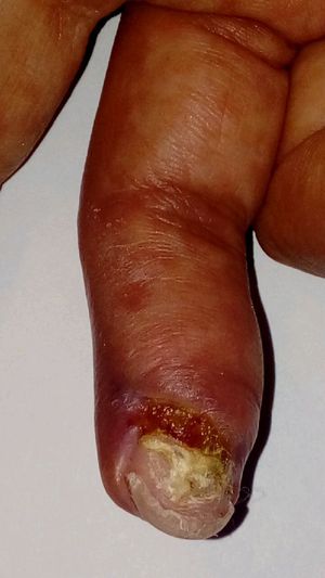 His finger got smushed. My guess is the trauma was caused by a something with a small surface area; Only things that come to mind would be mouse traps or some equipment used in carpentry/metal work/hobbies. What I don't get though is why the nail is on what appears to be the ventral side of his hand.