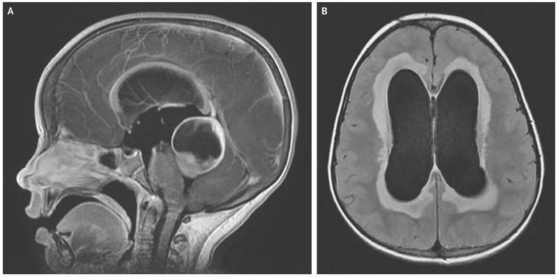 A 4-year-old girl with a 2-week history of progressive headache, nausea, vomiting, and irritability was brought to the emergency department. The patient was confused and combative. She had disconjugate gaze on extraocular examination and also had an unsteady, uncoordinated gait. Contrast-enhanced T1-weighted magnetic resonance imaging revealed a cystic mass measuring 3.4 cm by 3.9 cm by 4.4 cm in the quadrigeminal cistern, arising from the tectal plate and compressing the cerebral aqueduct (Panel A). Its presence resulted in obstructive hydrocephalus and bowing of the corpus callosum. Transependymal flow of the cerebrospinal fluid (CSF) was seen on the axial T2-weighted FLAIR (fluid-attenuated inversion recovery) sequences (Panel B). The patient underwent placement of an external ventricular drain, tumor resection, and endoscopic third ventriculostomy. Histologic examination of the tumor specimen led to a diagnosis of pilocytic astrocytoma. After surgery, the patient had complete resolution of her symptoms, and adjuvant chemotherapy was initiated. At follow-up 9 months after the surgery, the hydrocephalus had resolved without recurrence, and no further diversion of the CSF was required.