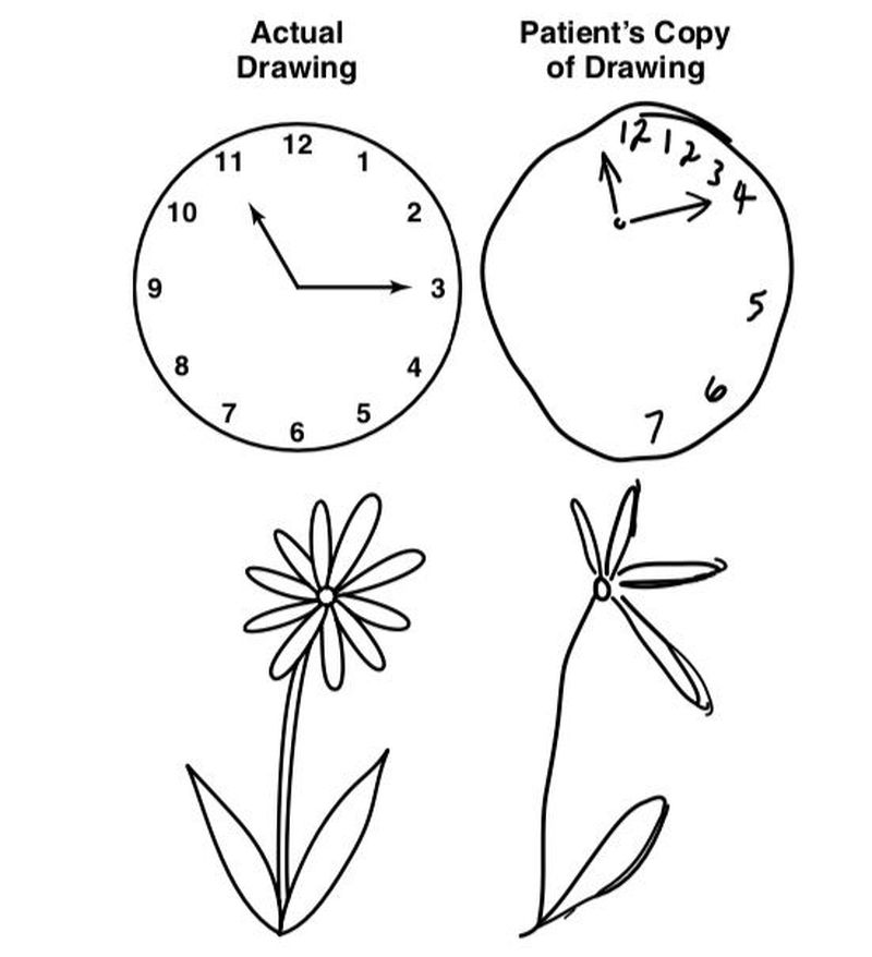 Illustration of drawings that might be made by a person who has neglect syndrome caused by severe damage in his or her right posterior parietal cortex compared with the actual drawing the patient was requested to copy. Note that the person’s ability to copy the left side of the drawings is severely impaired. The diagrams shows the way in which a person with a lesion in the right posterior parietal cortex might try to copy drawings. In these cases, the patient’s ability to copy the left side of the drawings is severely impaired. Also, such a person will always try to avoid using his or her left arm, left hand, or other portions of his or her left body for the performance of tasks, or even wash this side of the body (personal neglect syndrome), almost not knowing that these parts of his or her body exist.