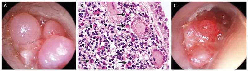 A 50-year-old man presented with a 6-month history of pain, intermittent otorrhea, and progressive hearing loss in both ears. He had a history of asthma, recurrent sinus disease with nasal polyps, and aspirin sensitivity. Otoendoscopy revealed polypoid masses in the external canals of both ears. The masses protruded from the middle ears through the tympanic membranes and were associated with viscous otorrhea (Panel A shows the right ear). Microscopic examination of the otorrhea revealed acute inflammatory cells with many eosinophils. Incisional biopsy revealed a polypoid proliferation of granulation tissue with mixed inflammatory infiltrate that consisted predominantly of eosinophils (Panel B, arrows). The patient had eosinophilia in the peripheral blood (1.2×103 eosinophils per microliter). A diagnosis of eosinophilic otitis media was made. Eosinophilic otitis media is a rare, intractable, chronic otitis media that is characterized by high-viscosity otorrhea and is often associated with nasal polyps and asthma. The patient was treated with topical and systemic glucocorticoids and had partial abatement of ear pain and otorrhea. He then underwent tympanoplasty, resection of the polypoid masses, and placement of a bone-anchored hearing aid in the right ear. Four months later, the patient had recurrent symptoms and was found to have relapsed eosinophilic otitis media in both ears (Panel C shows the right ear).