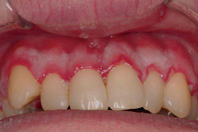Acute Herpetic Gingivostomatitis Maxillary facial gingiva with erythema and focal marginal erosions.