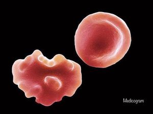 Micrograph taken with the Magnification of 6200X of a Healthy erythrocyte versus crenated one. Crenation is caused by dehydration, which distorts the cell. The main function of erythrocytes of course is to distribute oxygen to body tissues and carry the waste carbon dioxide back to the lungs. Crenation leads to severe reduction in their ability to carry out this function. So drink enough water ! Otherwise, your blood will become hyperosmolar and the erythrocytes fluid will be drained out, which makes them look like this. Same happens if you drink water with a high salt concentration.