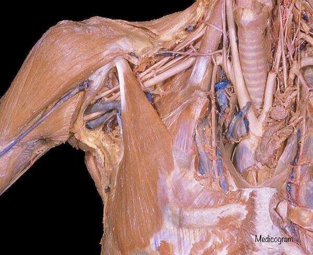 Incredibly well performed dissection of the thorax :)You can easily clearly identify the pectoralis and deltoid muscle, the heart and trachea, the brachial plexus and the arteria subclavia and more.This is a really an incredible work, because it is really hard to show those structures in such a clean way.
