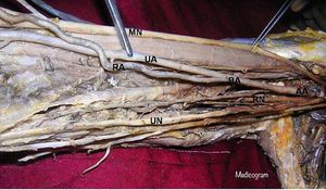 Photo Showing an incredible bifurcation of the brachial artery:AA - axillary arteryBA - brachial arteryUA - ulnar arteryRA - radial arteryMN - median nerveUN - ulnar nerveRN - radial nerve