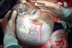New-born with a caul;A caul (Latin: Caput galeatum, literally, "helmeted head") is a piece of membrane that can cover a newborn's head and face.Birth with a caul is rare, occurring in fewer than 1 in 80,000 births. The caul is harmless and is immediately removed by the physician or midwife upon delivery of the child.In medieval times the appearance of a caul on a newborn baby was seen as a sign of good luck. It was considered an omen that the child was destined for greatness. The midwife would rub a sheet of paper across the baby's head and face, pressing the material of the caul onto the paper. The caul would then be presented to the mother, to be kept as an heirloom.