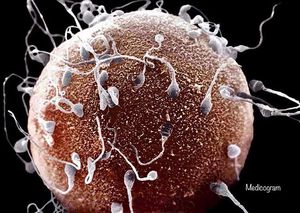 An Ovum (Egg cell) Surrounded by Sperms.This is an Electron micrograph, depicting an Ovum surrounded by too many sperms in the uterus.This actually depicts fertilization, The process by which male gamete fuses with the female gamete.
