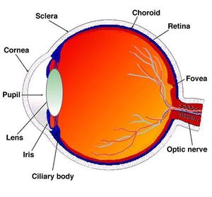 Anatomy of Human Eye;The eye is our organ of sight.The eye has a number of components which includes cornea, iris, pupil, lens, retina, macula, optic nerve, choroid and vitreous..- Cornea: clear front window of the eye that transmits and focuses light into the eye..- Iris: colored part of the eye that helps regulate the amount of light that enters..- Pupil: dark aperture in the iris that determines how much light is let into the eye.. - Lens: transparent structure inside the eye that focuses light rays onto the retina..- Retina: nerve layer that lines the back of the eye, senses light, and creates electrical impulses that travel through the optic nerve to the brain..- Macula: small central area in the retina that contains special light-sensitive cells and allows us to see fine details clearly. .- Optic nerve: connects the eye to the brain and carries the electrical impulses formed by the retina to the visual cortex of the brain..- Vitreous: clear, jelly-like substance that fills the middle of the eye.