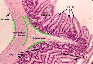 The Middle part of small intestine;The jejunum is the middle section of the small intestine. The jejunum lies between the duodenum and the ileum. The lining of the jejunum is specialized for the absorption, by enterocytes, of small nutrient particles which have been previously digested by enzymes in the duodenum. Once absorbed, nutrients (with the exception of fat, which goes to the lymph) pass from the enterocytes into the enterohepatic circulation and enter the liver via the hepatic portal vein, where the blood is processed.