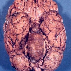 Atherosclerotic aneurysm of the basilar artery.This huge aneurysm of the basilar artery is not congenital, but atherosclerotic. Severe atherosclerosis may gradually weaken the wall of an artery, promoting their aneurysm. The most common example is the abdominal aorta. The aneurysm was not broken and was found at autopsy. It caused noticeable deformation of the anterior surface of the brainstem. The aneurysm was filled with mixed thrombus arranged in several concentric layers. However, there was a light and maintaining blood flow (otherwise there would have been massive brainstem infarction, incompatible with life). Intracranial atherosclerotic aneurysms are much rarer than congenital aneurysms.