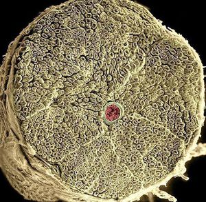 Incredible coloured scanning electron micrograph (SEM) of section through a human spinal nerve :) The nerve is composed of numerous bundles of myelinated axons. In the centre is a blood vessel filled with red blood cells.The human body contains 31 paired spinal nerves.The spinal nerves connect the brain/spinal cord with the muscles of your body.If you want to move your leg, your brain sets the impulse, the signal goes down your spinal cord until it reaches the lower segments.There it gets switched to a so called "motor neuron", which leaves the spinal cord and leads to the muscle. The signal activates the muscle and it contracts. That's how we do everything.