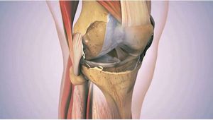 The Knee joint:)The knee joint joins the thigh with the leg and consists of two articulations; one between the femur and tibia (tibiofemoral joint), and the other between the femur and patella (patellofemoral joint). It is the largest joint in the human body. The knee is a modified hinge joint, which permits flexion and extension as well as slight internal and external rotation. The knee joint is vulnerable to injury and to the development of osteoarthritis.