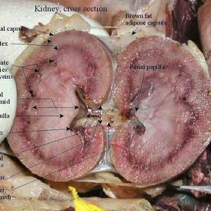 Cross sectional view of Kidney with each part labeled.When the body has taken all it needs from foods and liquids, the waste is carried away in the blood. The kidneys’ job, among others, is to remove that waste to prevent damage to the body.Of the approximately 180 liters of liquid passing through the kidneys a day, less than half actually turns into urine. The amount of water in urine depends on a complex mixture of liquid intake, physical activity, and influence from the antidiuretic hormone (a small molecule that helps control water balance) from the pituitary gland.Urine is typically 95 percent water and 5 percent dissolved solids and gases. It contains the following:-waste from nitrogen: creatinine, urea, and uric acid-electrolytes: salt and sulfates-pigment: derived from bile, food, and drugsThe waste removal occurs inside millions of tiny coiled tubes of arteries, veins, and ducts called nephrons. The nephrons filter unwanted materials while keeping proteins and cells in the bloodstream.Before the liquid leaves the body as urine, the kidney further fine-tunes the composition of the urine through a process known as tubular secretion. During this, potassium enters urine, as well as fine-tunes the pH balance of bodily fluids by hydrogen ion secretion.At the tip of each nephron, a tiny capillary called a glomerulus intertwines with a tubule. A tubule is a microscopic tube used to collect urine. This is where waste leaves the blood and enters the urinary system.If the kidneys decide to keep substances, they go through a process known as tubular reabsorption. The needed materials pass back through the bloodstream where they will be used again and Recycled.