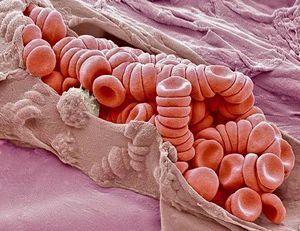 Erythrocytes showing roleaux effect in a Ruptured venule under the scanning electron microscope (SEM) with Magnification of 2300 X the original size.The image is Really Adorable.