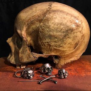 A natural human skull 💀 in Contrast to Some beautifully Designed Skull Rings
